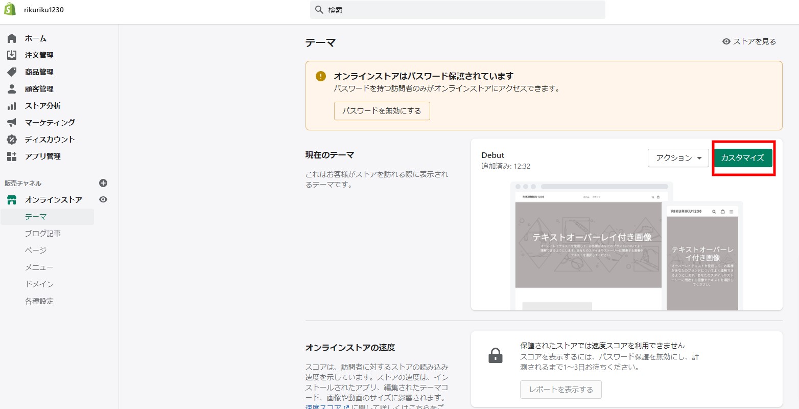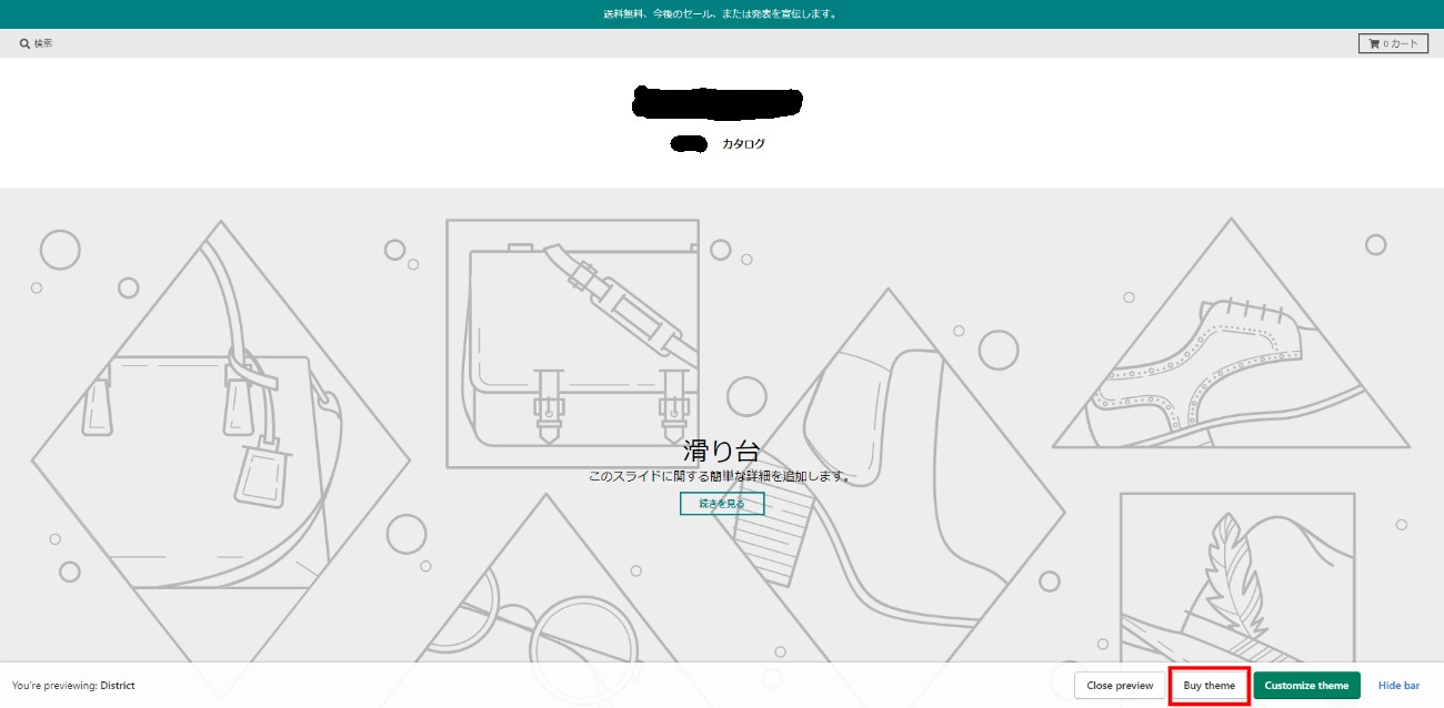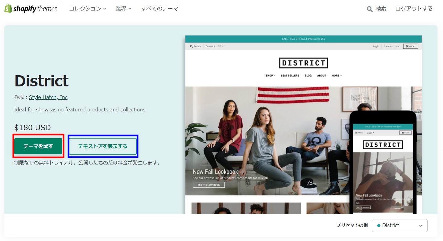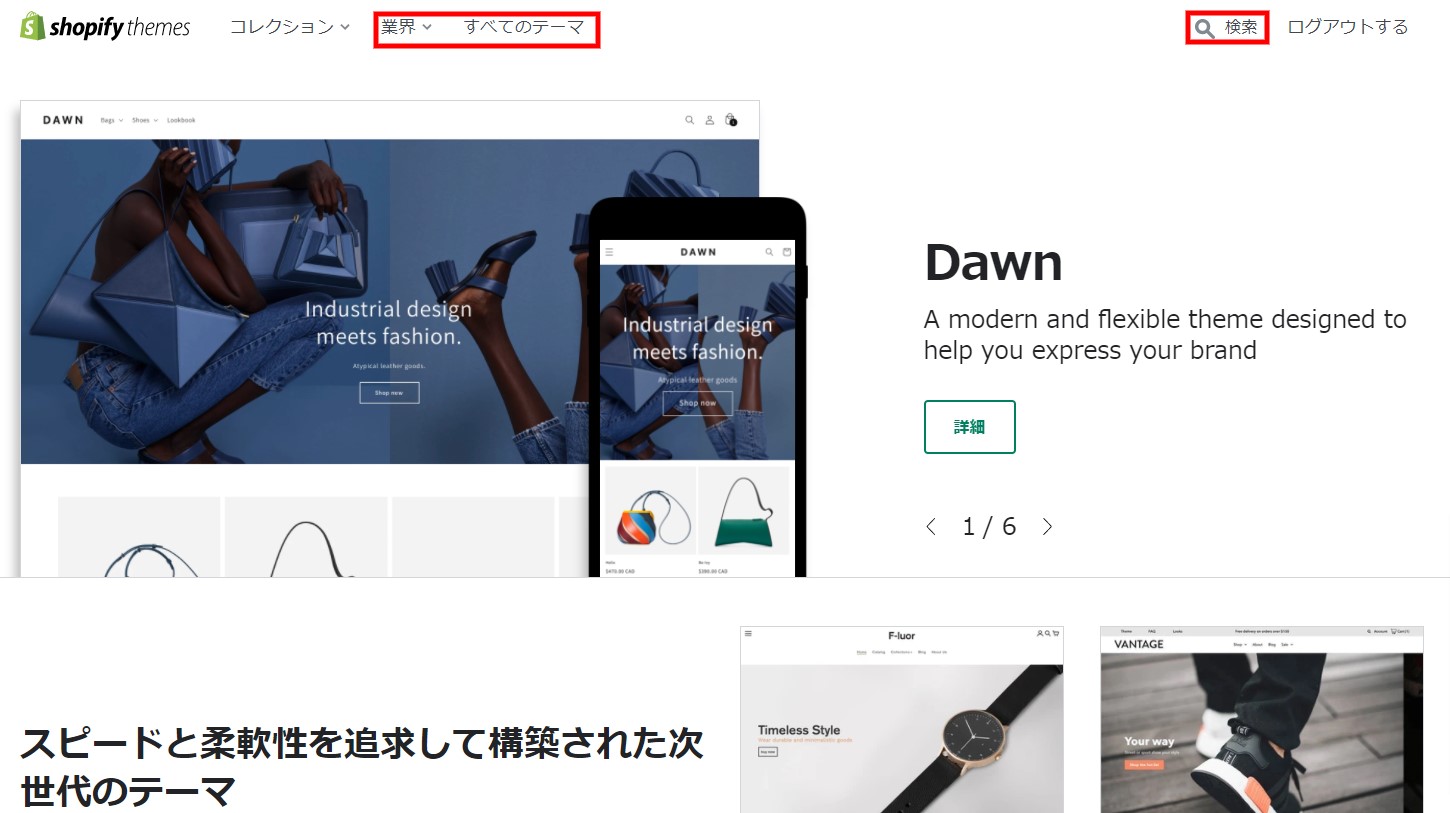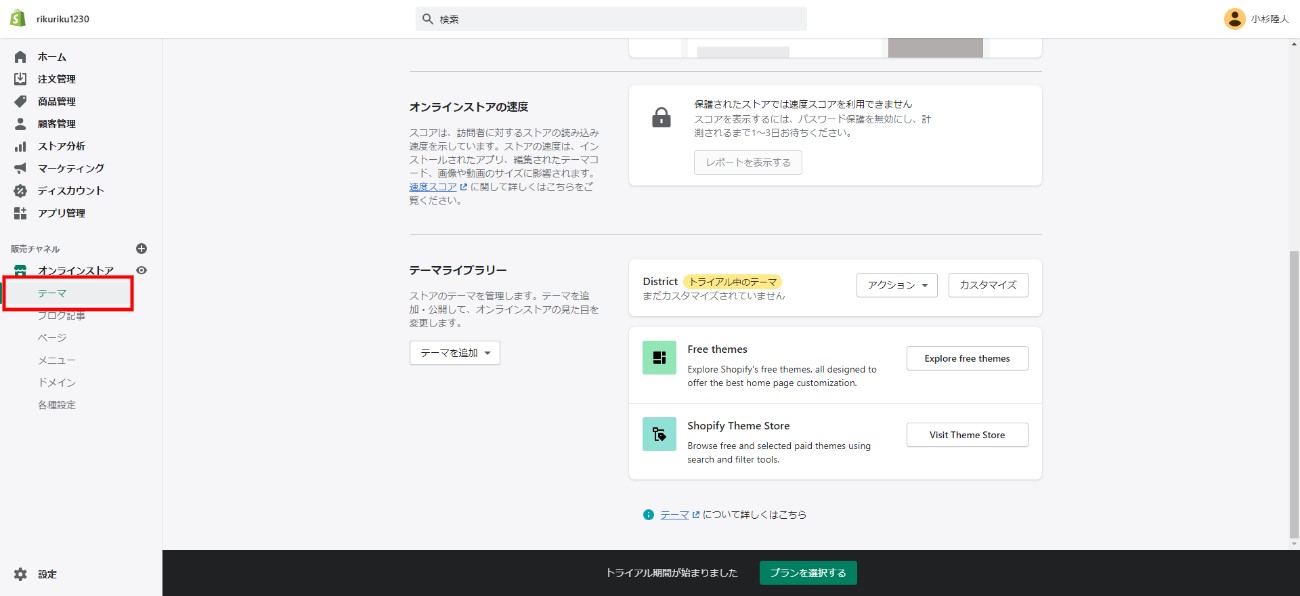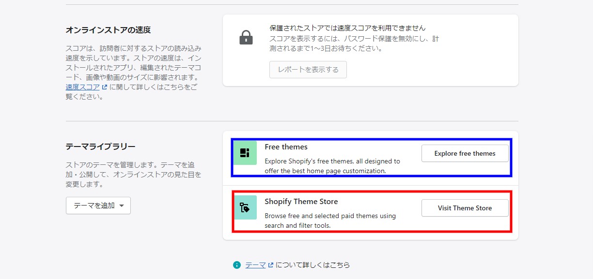 赤枠で囲ってある「Shopify theme store」はShopifyテーマストアへ 移動し、無料テーマと有料テーマの中から選択できます。