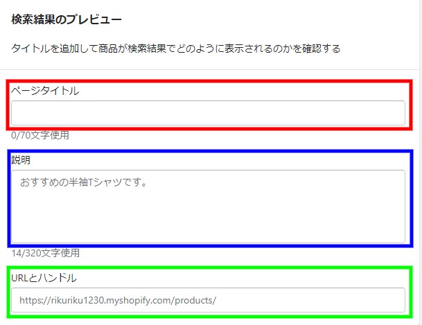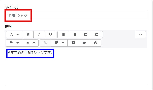 3.赤枠で囲ってある箇所に「商品名」を記入。青枠で囲ってある箇所に「商品説明」を記入。