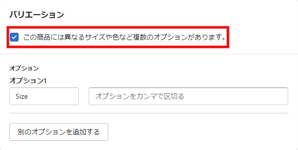 画像内の項目は任意での入力になります。1つの商品に複数のサイズや色が存在する場合は、赤枠で囲ってある箇所をチェックします。