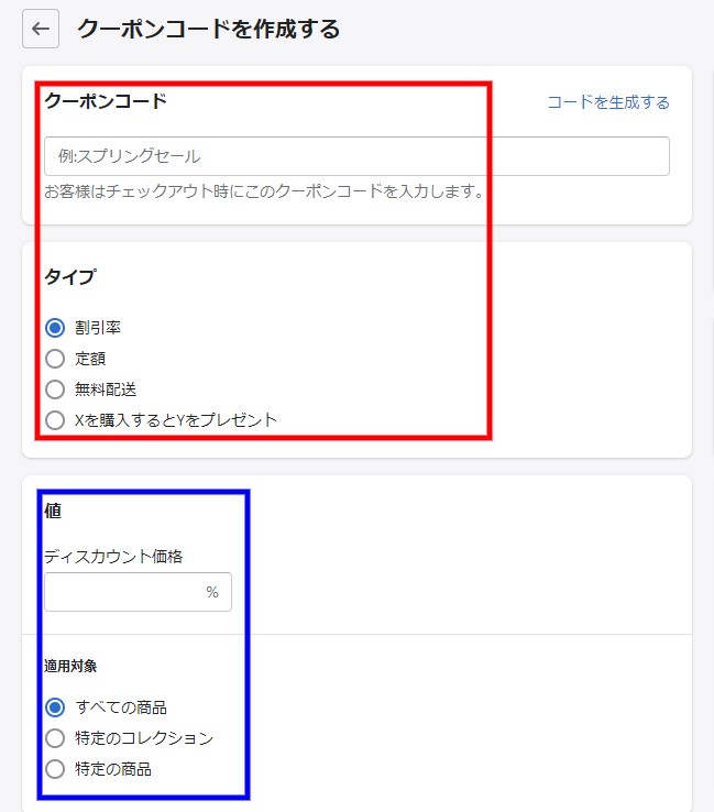 3.赤枠で囲ってある「クーポンコード」・「タイプ」を入力。