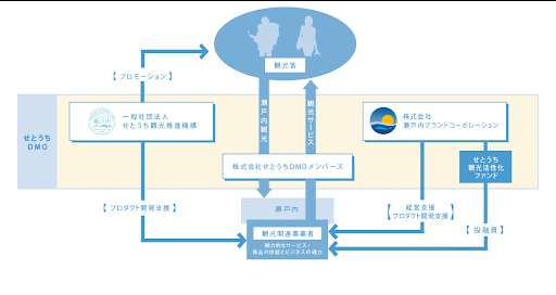 そうです。せとうちDMOでは大きく3つの組織で動いています。一般社団法人せとうち観光推進機構では主に観光客に対するプロモーションを行っています。インバウンドであれば海外の方向けにせとうちをプロモーションして集客を行う。その人たちが来て事業者様が宿、飲食店やアクティビティーなどのサービスを提供する。その事業者に対する支援を株式会社瀬戸内ブランドコーポレーションで行い、一部資金の投融資というところでせとうち観光活性化ファンドというおよそ100億円のファンドを作り資金投資から経営サポートまで行っています。