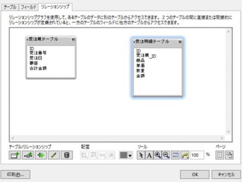 この画面で、各テーブルで紐づけたい項目同士を、マウスを操作して関連付けます。