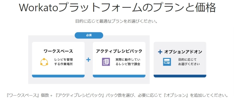 Workatoの価格は、ワークスペース+アクティブレシピ+オプションアドオンによって決まります。