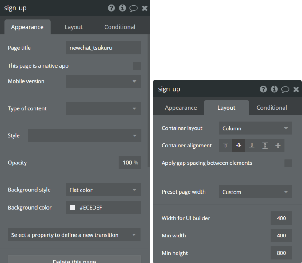 設定の画面が開いたら「Layout」タブをクリックしてください。今回はモバイルで表示するアプリを想定して設定しました。