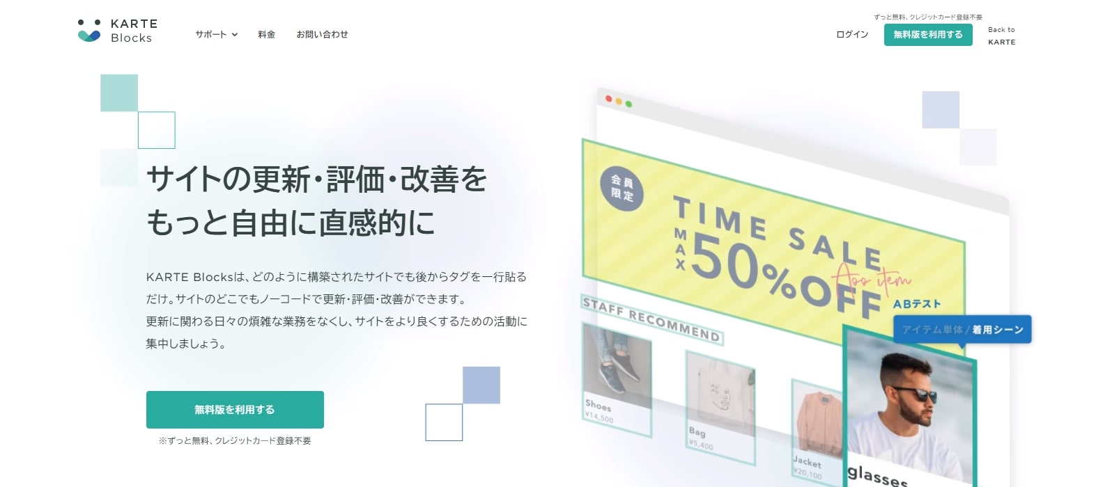 Karte blocksとは、「Block Management System」という独自の管理システムを利用して、既存のサイトにタグを1行張り付けるだけで、サイトの更新・評価・改善ができるノーコードツールです。