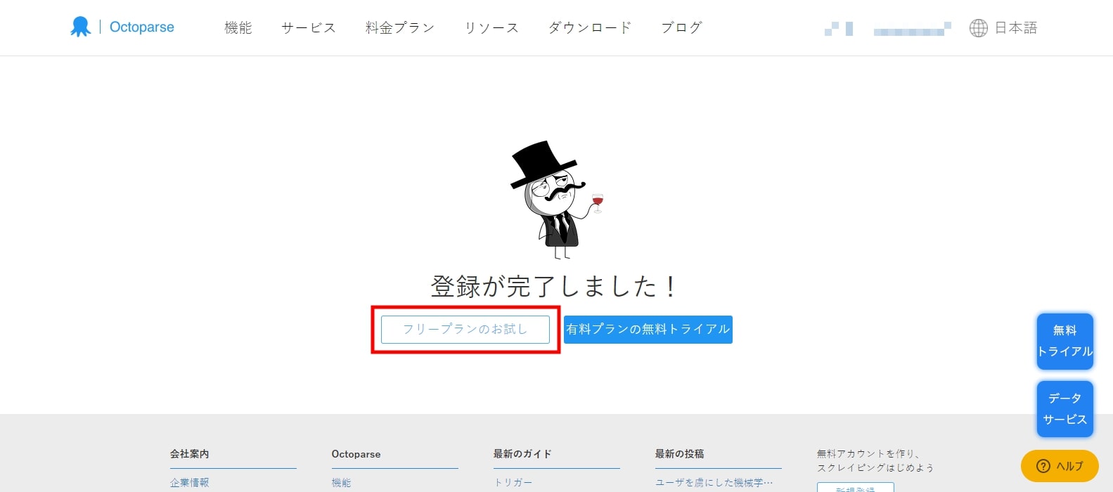 まだ、Octparseに登録していない方は以下の手順を参考に登録を行ってください。