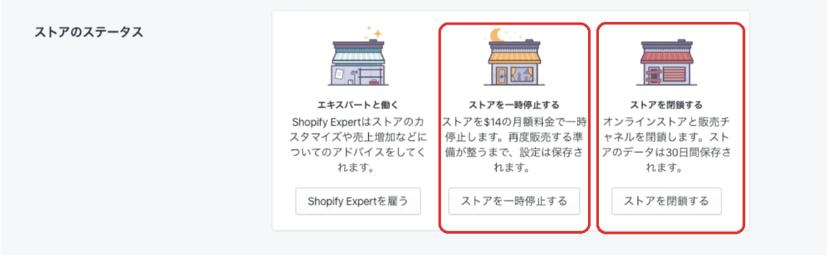 STEP3.ステータスセクションで「ストアを一時停止する」か「ストアを閉鎖する」をクリック