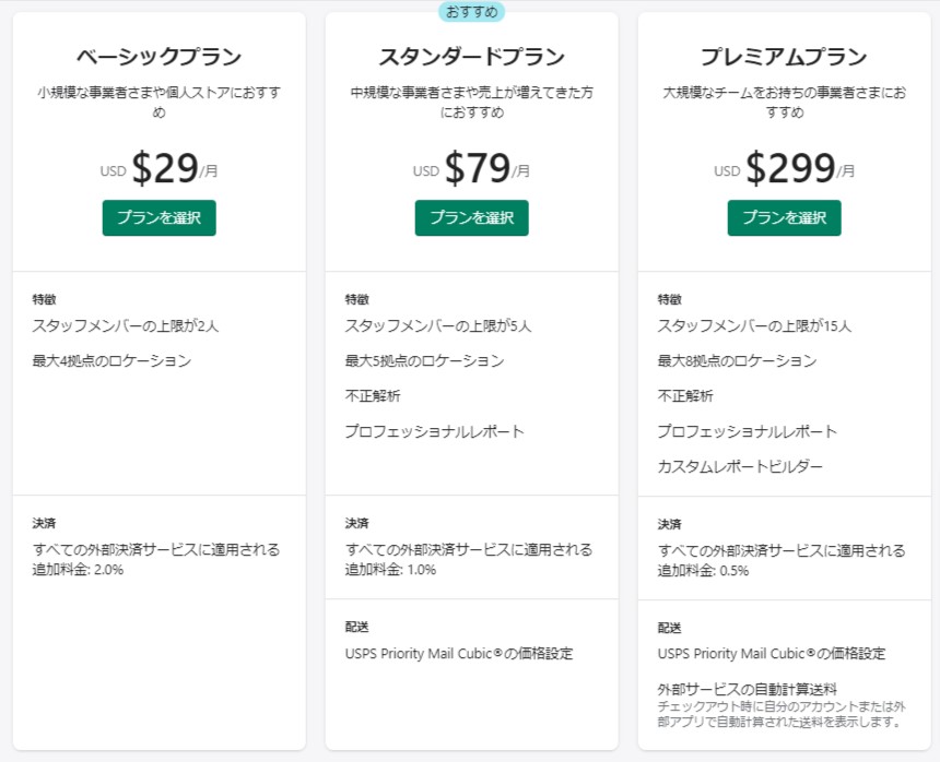 ShopifyスタータープランとShopify Plusプランについては、後ほど詳しく解説します。