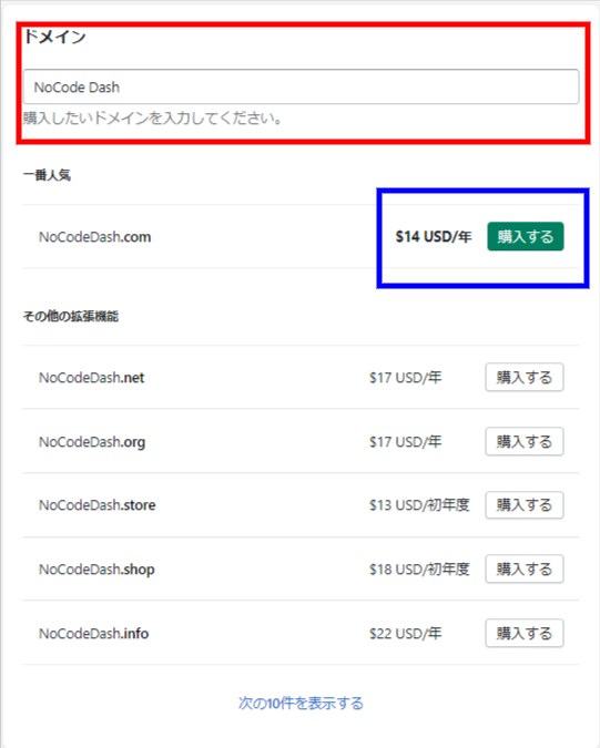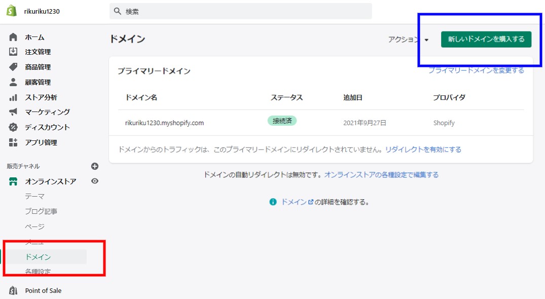 *Shopifyから独自ドメインを購入することで、独自ドメインとサービスの接続作業が不要になりますので、理由がない限りShopifyから購入することをおすすめします。
