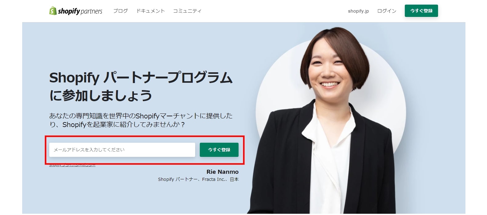 Shopifyパートナーのログインは、「Shopifyパートナープログラム」の「ログインボタン」からできます。