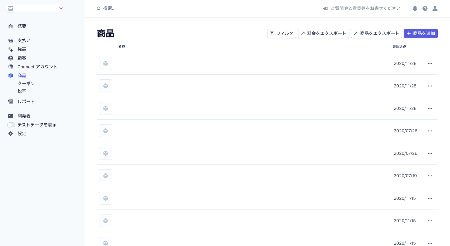 Stripeで定期支払いの設定を行うためには、まず顧客と商品の情報を登録する必要があります。ダッシュボード上の「顧客」や「商品」の画面右上にある「新規」ボタンより、情報の登録を行いましょう。